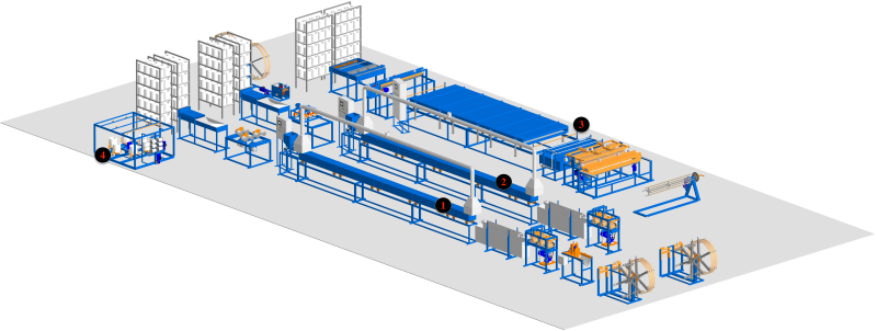 Комплект оборудования позволяет производить от 2600 м2 композитной сетки в сутки, в комплекте присутствует линия (спутник) для производства поперечного прутка для сетки.